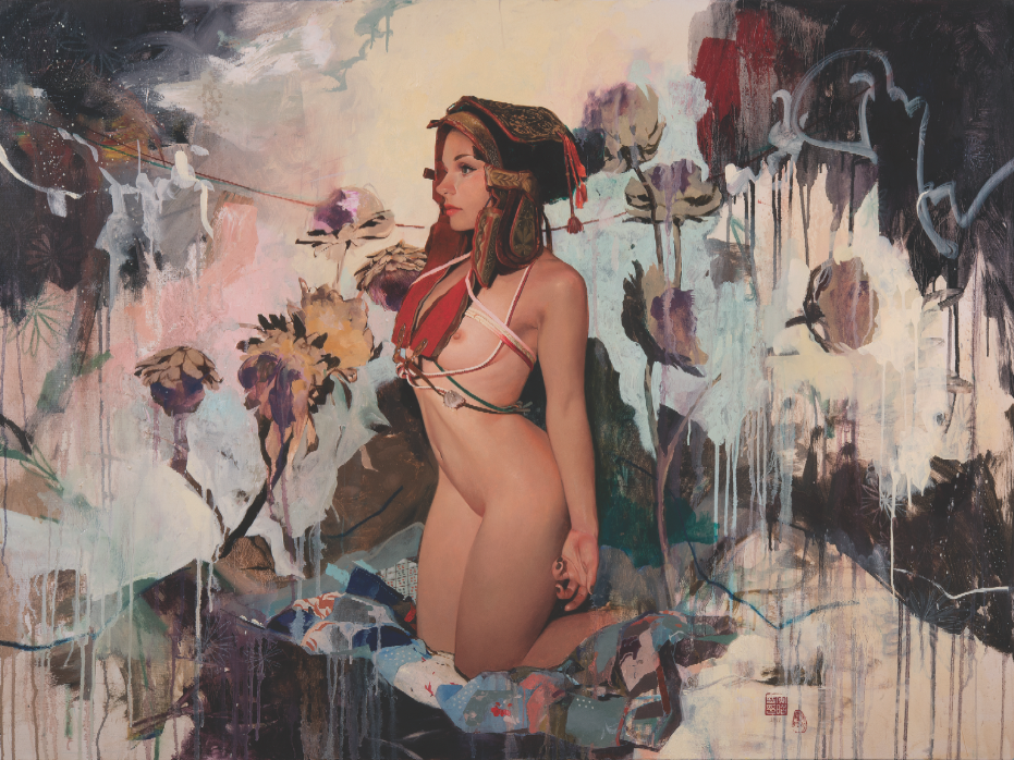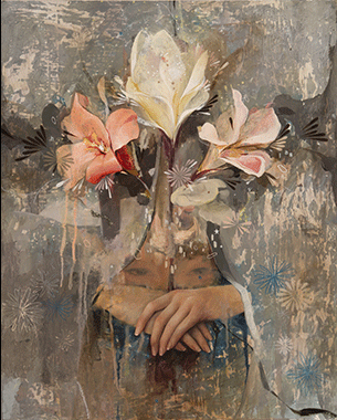 “Kiokada,” the title of the artist’s upcoming exhibition at EVOKE Contemporary in Santa Fe, is a phonetic Korean translation of the phrase, “to remember.” Whether the narrative from one of Milk’s pieces is traceable or remains mysterious to the viewer, we can sense the artist’s imparted emotions to cultivate a nostalgic connection with her enchanting female figures and abstract imagery. While the meanings behind most works are deeply intuitive and often unexplainable, others have a clearer message. “Flowers for the Asleep,” for example, is a 20x16” oil painting infused with crushed fool’s gold that glimmers on the canvas. Three luminous flowers blossom in different directions as they hover over the hands of an absent figure. The left hand solemnly rests over the right, signifying a respectful Korean gesture that is used when bowing to an ancestor’s grave. The blooms represent the artist’s deceased grandparents and the placement of the hands honors their memory, imparting a sense of longing for the lost and marking a distinct emotional phase from the artist’s life.